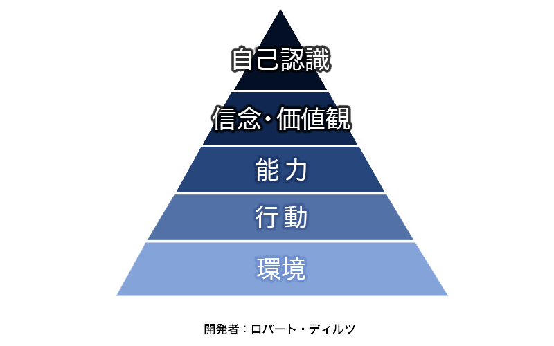 その5段階については、下記のとおり、下から、環境、行動、能力、信念・価値観(大切なこと)、そして、自己認識です。