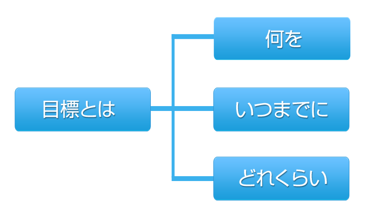 目標とは図にあるようにやること、やりたいことに対して、「いつまでに」「何を」「どれくらいやるのか」。