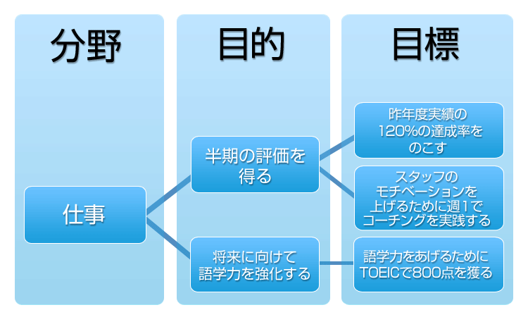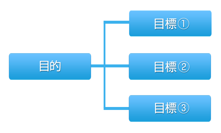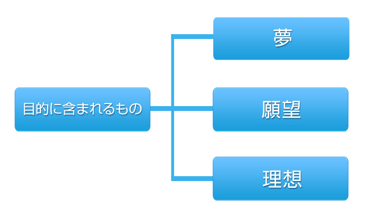 ですから、場合によっては以下のような枠組みを参考にしていただければ、目的と目標の違いを把握しスムーズな目標設定が可能になります。