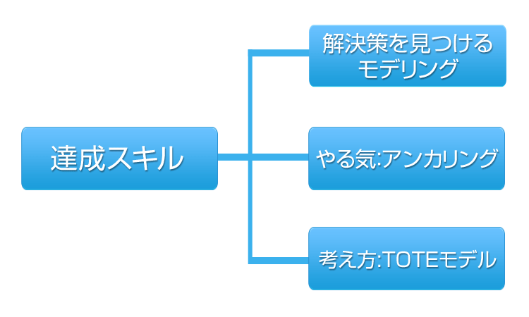 達成スキルとしては、NLPから「解決法」「やる気」「考え方」について、