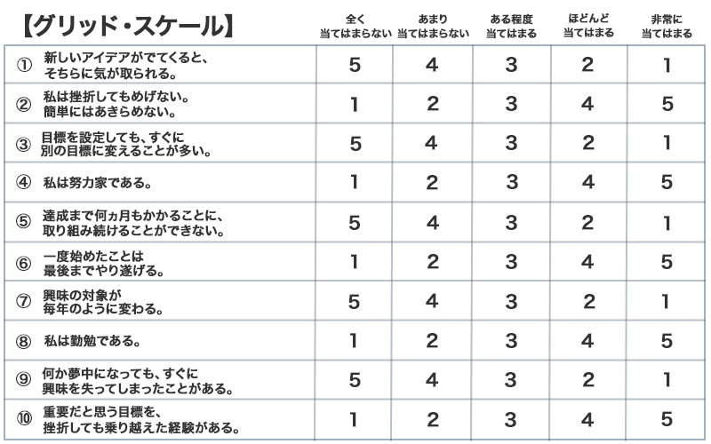 書籍「GRIT」で紹介されているグリッドスケールを使って、今のあなたのやり抜く力を測定してみましょう。