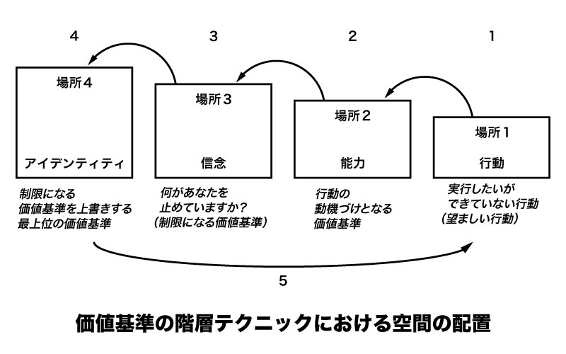 「場所2」と「場所3」を飛ばして、「場所4」に立ちます。望ましい行動に最上位の価値基準を当てはめ、自分に制限をかけている抵抗や反発を上書きします。