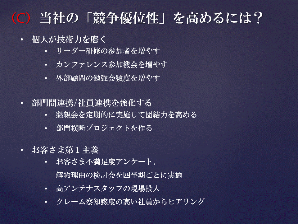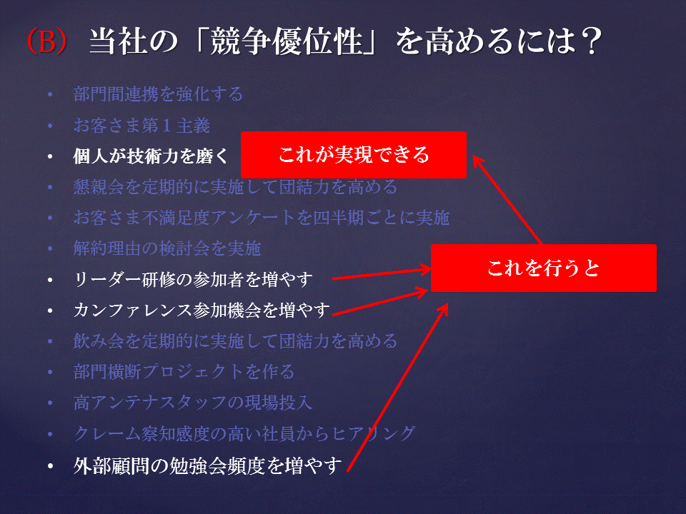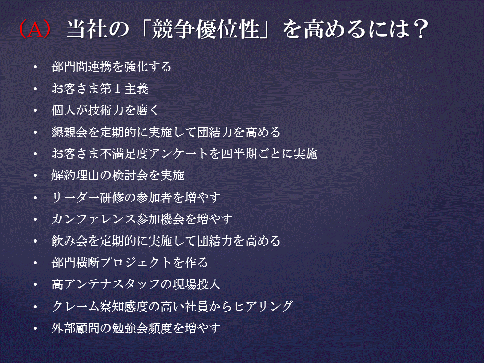 あなたが、とある企業の経営企画部長であるとします。社長から「当社の競争優位性を高めるにはどうしたらよいか」と言われたときに、どう答えますか?思いつくままに列挙すると、次の(A)の図のような内容を並べることができます。