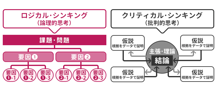 ロジカル・シンキングは「問題解決にあたり、情報を分類・整理して分かりやすく論理的に解決策を検討すること」であり、クリティカル・シンキングは「そもそもの前提が正しいのか、他に考えられることはないのか」と、問題解決に向けて、より掘り下げて検討していくものと言えます。