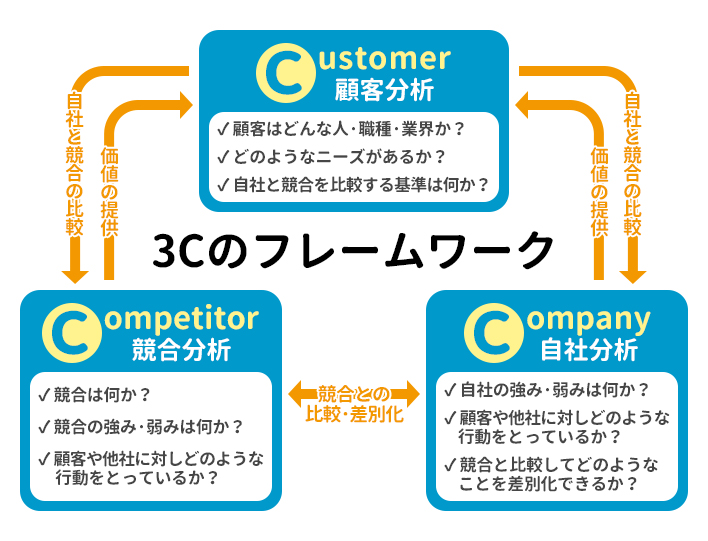 物事を整理するときに使うフレームワークです。自社を取り巻く環境を全体と捉えたときに、Customer(顧客)、Competitor(競合)、Company(自社)、 Channel(販路)の切り口から全体像を俯瞰します。