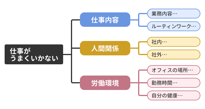 ここで大切なのは、各段階ごとに抜け漏れなく状況を洗い出すことです。例えば、自分では人間関係が原因ではないと思っていたけれど、抜け漏れなく洗い出すことで「業務内容より、社外の取引先との人間関係が原因なのかもしれない」と気づくことができる、などの効果があります。