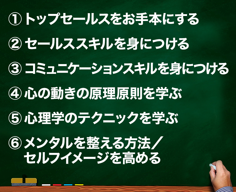:トップセールスがお客様から信頼され、感謝され、圧倒的な結果を出すのには、それだけの理由があります。その理由とは考え方・視点・スキル・メンタル・セルフイメージなどですね。これらを学び、お手本にしながら自分のものにしていきましょう。
