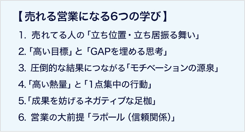 これらは私が今まで出会ってきた、全国や世界レベルで「トップセールス」と言われる方達に共通したポイントです。もちろん、まず最初にやるべきは「営業の基本を徹底する」ことですが、これからお話する「6項目」も、営業力や売上に違いを作ります。